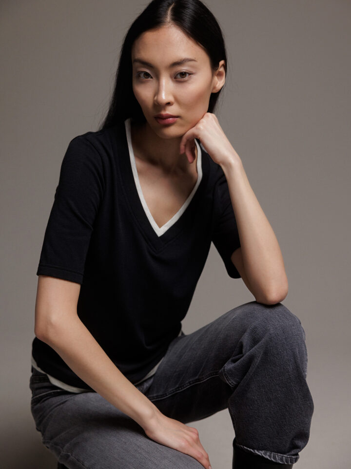 • Rippbündchen an Ärmeln und Saum