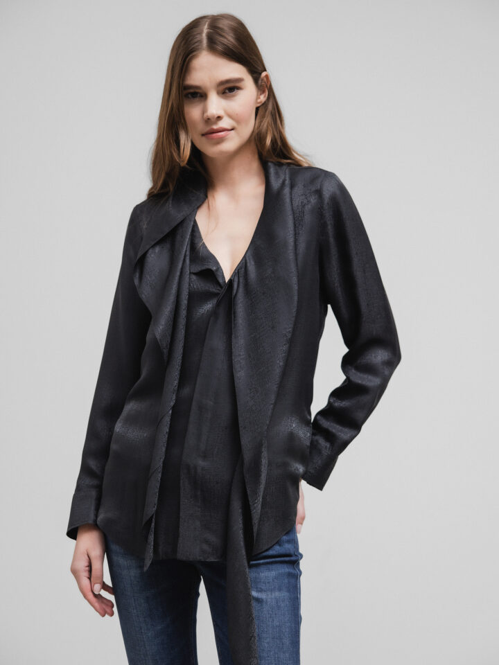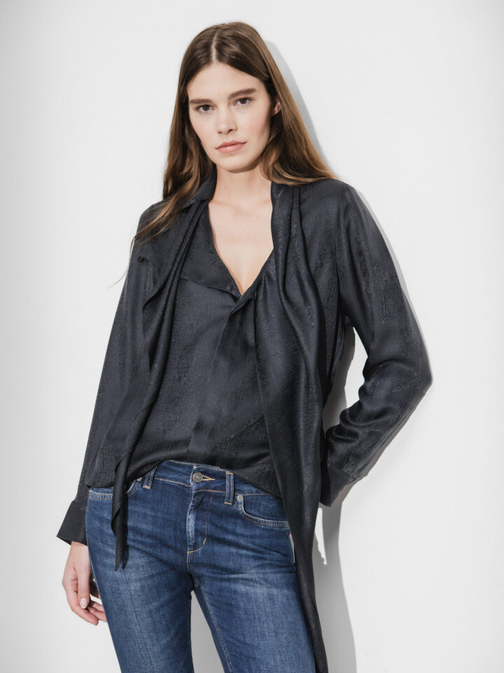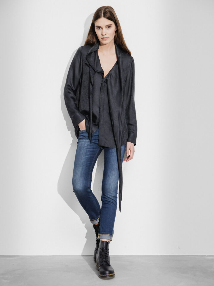 • Schließt mit durchgehender, verdeckter Knopfleiste